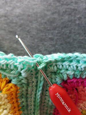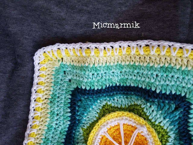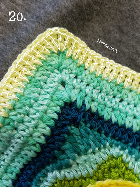 19 Byt garn, Denim Catona färg 170. Nu ska vi virka runt den stora rutan gjord av 9 små rutor. (första hst = 2 lm). *1 hst i varje m, (över hörnen där rutorna möts virkas 4 hst i bmb, Se bilder), «2 hst, 2 lm, 2 hst» i lmb gjord av 2 lm (hörn på stora rutan)* 4 ggr. Avsluta varvet med 1 sm i andra lm på första hst. (108 hst på varje sida)