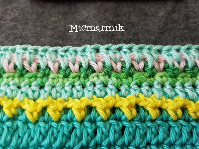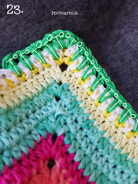 23 Byt garn, Catona färg 389. (första hst = 2 lm), *«1 hst, 2 lm, 1 hst» i lmb gjord av 2 lm (hörn) ** 1 lm, 1 hst över lmb gjord av 1 lm på föregående v 22 och ner i m på v 21** 59 ggr* 4 ggr. Avsluta varvet med 1 sm i andra lm på första hst.