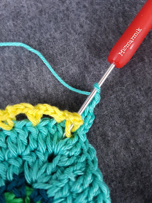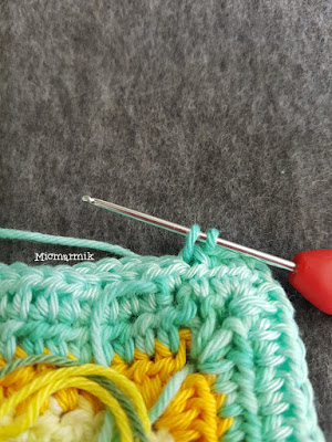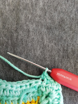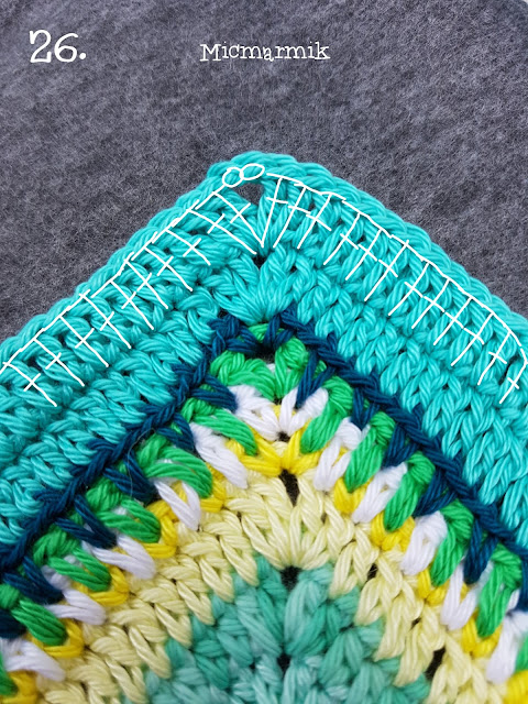 27.2 Nu fortsätter vi med garnet (Catona färg 253) från v 26. Virka 3 sm fram till lmb gjord av 2 lm (hörn), (första st = 3 lm) *«2 st, 2 lm, (på andra sidan fm från föregående v 27.1) 2 st» (räknas som hörn, se bilder). 1 m i varje m och bmb på de som är virkade i fmb med gul färg. = 128 st* 4 ggr. Avsluta varvet med 1 sm i tredje lm på första st.