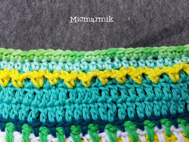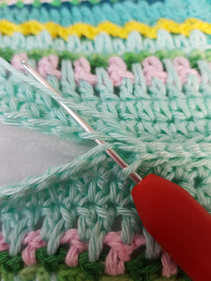 29 Byt garn, Denim Catona färg 171.*«1 fm, 2 lm, 1 fm» i lmb gjord av 2 lm (hörn), **1 fm i varje m** 128 ggr* 4 ggr. Avsluta varvet med 1 sm på första fm.