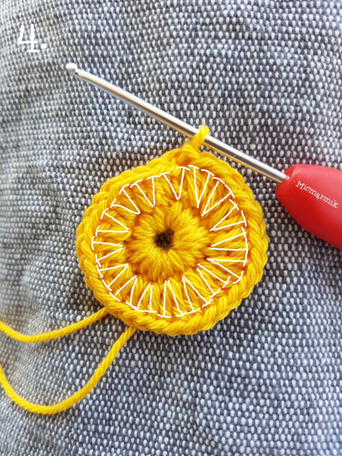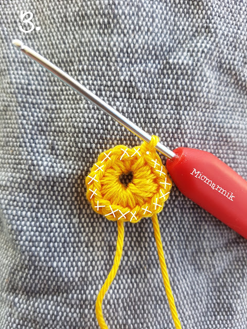 3 16 fm i ringen. Avsluta varvet med 1 sm i första fm. (Totalt 16 fm)