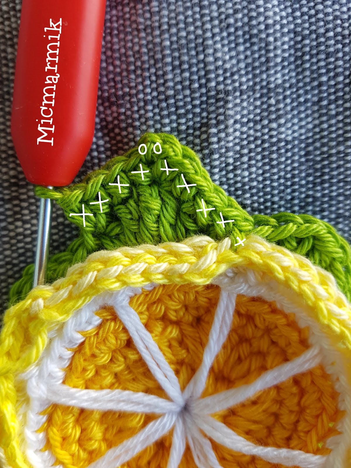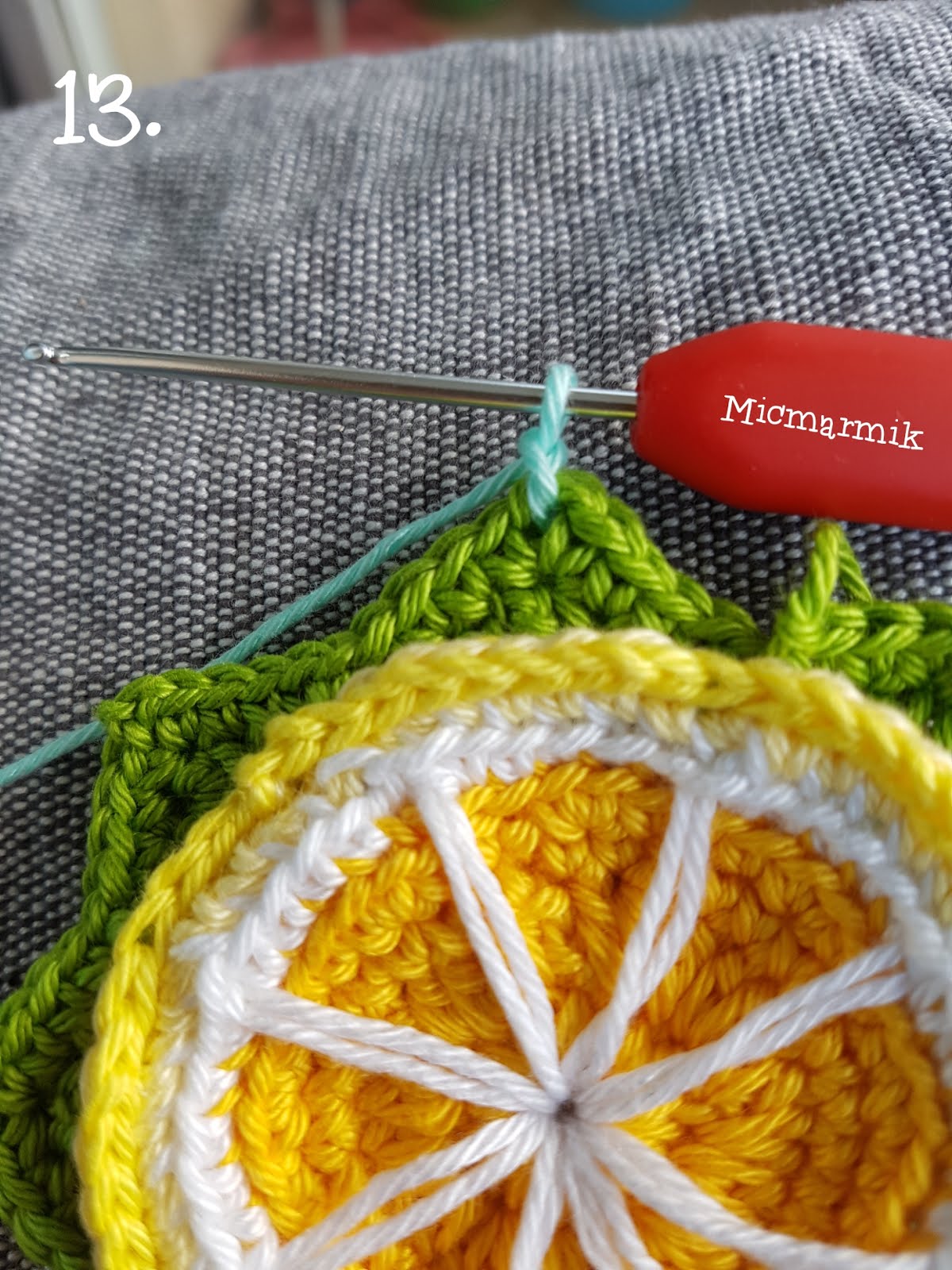 13 Byt färg (385 citron, 264 apelsin, 280 lime, och 392 grapefrukt). Starta i toppen av ett blad. *2 fm i lmb gjord av 2 lm, 1 fm, 2 hst, 3 st, 2 hst, 1 fm* 8 ggr. Avsluta varvet med 1 sm i första fm. Klipp av garnet. (Totalt 32 fm, 32 hst, 24 st)