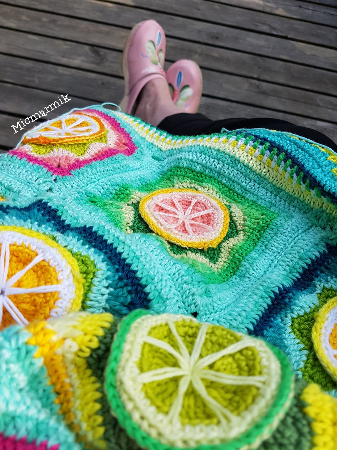 14 Byt garn till Scheepjes Catona Denim (färg 166 citron, 130 apelsin, 120 lime, 171 grapefrukt). Starta varvet i sista fm av 2 i lmb gjord av 2 lm varv 13, *13 fm, 1 hst, 2 st, «1 dst, 2 lm, 1 dst» i nästa m, 2 st,1 hst, 2 fm* 4 ggr. Avsluta varvet med 1 sm i första fm. Klipp av garnet. (Totalt 60 fm, 8 lm, 8 hst, 16 st, 8 dst)