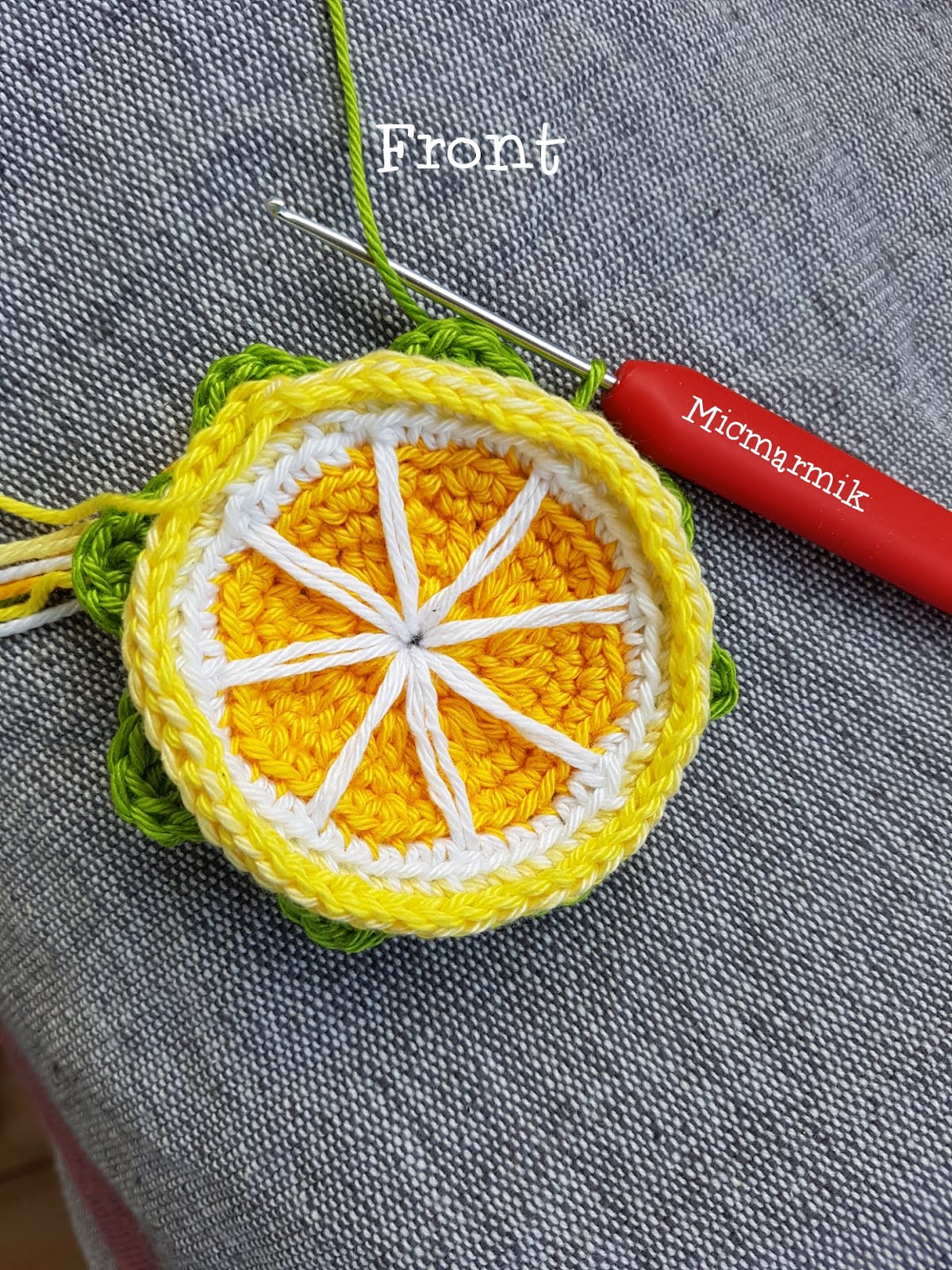 7 Byt färg (106 citron och apelsin, 100 lime, och 523 grapefrukt). Det här varvet virkas i bmb. *5 fm, 1 hst igenom hålet i mitten* 8 ggr. Avsluta varvet med 1 sm i första fm. Klipp av garnet. (Totalt 40 fm, 8 hst)