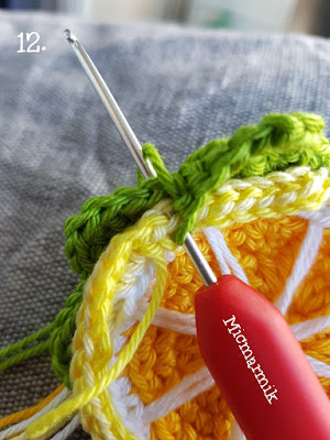 11Vänd på Citronen så framsidan ligger uppåt. 1 sm fram till lmb gjord av 4 lm *«1 fm, 1 hst, 1 st, 1 dst, 1 st, 1 hst, 1 fm» i nästa lmb gjord av 4 lm* 8 ggr. Avsluta varvet med 1 sm i första fm. (Totalt 16 fm, 16 hst, 16 st, 8 dst)