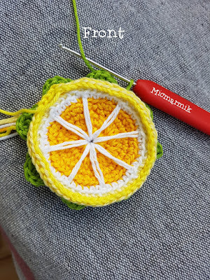10 Byt färg (205 citron, 245 apelsin, 212 lime, och 515 grapefrukt) Vänd på Citronen så baksidan ligger uppåt *1 fm i långa hst varv 7, 4 lm* 8 ggr. Avsluta varvet med 1 sm i första fm. (Totalt 32 lm, 8 fm)
